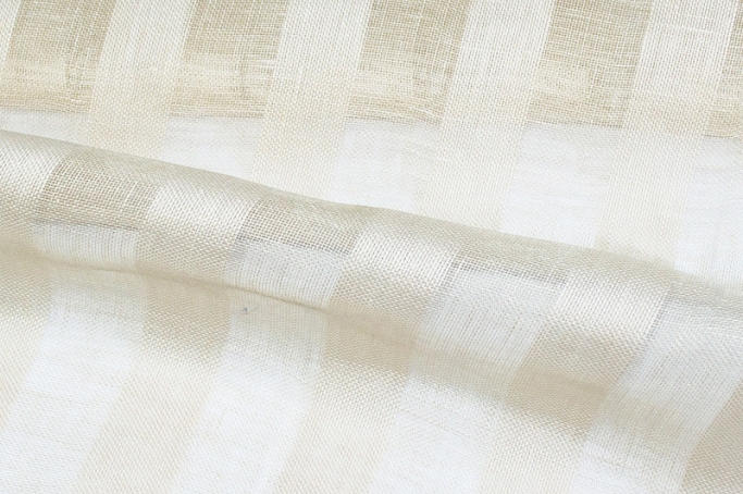 Льняной тюль - полностью прозрачная ткань очень красивого бежево-соломенного цвета. Она - тонкая, в широкую полоску с более разреженным переплетением нитей, что придаёт ткани визуальную лёгкость и нежность. Предназначена для украшения окон или визуального разграничения пространства. Благодаря своей прозрачности, такая ткань не будет оставлять четких контуров и очень хорошо смотреться в дорогом интерьере.