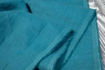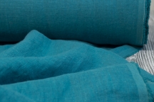 Потрясающая льняная ткань приглушённого синего цвета с тёмным бирюзовым оттенком морской волны с эффектом жатости и лёгкой мятости, достигнутых путём специальной обработки - стирки с энзимами. Благодаря энзимной стирке, ткань приобретает приятные характеристики в виде невероятной мягкости и воздушности. Такой лён пользуется большим спросом, так как не дает усадку и не требует утюжки после стирки. Ткань с таким эффектом ещё называют вареный лён или stone washed. Нарочитая лёгкая равномерная жатость и мятость делает полотно стильным, расслабленным, эксклюзивным. Такой жатый эффект пользуется особой популярностью в Европе. Изделия из вареного льна обладают определённым шармом, а их обладатель характеризуется изысканным вкусом. Ткань - средней плотности, не просвечивает, идеальна для бохо-платьев, брючных и юбочных костюмов, юбок, жакетов, брюк, сарафанов.