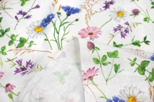 Нежный цветочный рисунок на льняной ткани украсит собой любой наряд и освежит образ. Гармонично подобранные оттенки синего, розового и салатово-зелёного цвета на бело-молочном фоне напоминает о лете. Ткань - средней плотности, мягкая, приятная на ощупь, прошла процедуру умягчения, энзимную стирку, не будет давать усадку после стирки, не требует утюжки, имеет лёгкую естественную мятость, легко драпируется в складки. Для нежных, женственных льняных платьев и сарафанов, блузок с объёмными рукавами фонариками, юбок, стильных цветочных льняных жакетов, красивых комбинезонов, текстильных предметов интерьера - лёгких штор, декоративных наволочек, скатерти.
