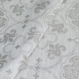 Достаточно плотная однотонная жаккардовая ткань с орнаментом натурального цвета. Ткань выглядит очень добротной и дорогой. Подойдёт для изготовления штор, скатертей, покрывал.