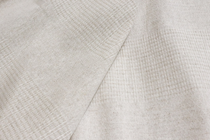 Широкий неокрашенный лён с хлопком с жаккардовым плетением натурального молочно-серого цвета идеален для штор, покрывала, пледа. Нитями прорисован на ткани жаккардовый рисунок в виде орнамента, чередованием крупной полосы с рисунком в виде небольших ромбов и полосой с плетением рогожка. Плетение слегка рыхлое, при использовании ткани для штор, свет будет проникать в комнату в дневное время суток, в вечернее и ночное плотности достаточно, чтобы закрыть видимость с улицы. Ткань - приятная на ощупь, драпируется в слегка держащие форму, средне-крупные складки, нейтральна по цвету, соответственно подойдёт в любой интерьер.