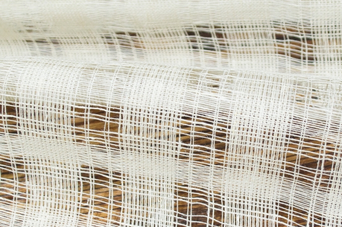 Разреженная портьерная ткань спокойного бежево-молочного цвета. Прозрачность создают продольные полоски с более разреженным переплетением нитей, при этом нити, участвующие в плетении достаточно плотные, ткань выглядит как тонкая сетка и драпируется в полукруглые, держащие форму складки. Наиболее уместна будет в интерьерах в эко стиле или прованс, хорошо смотрится в сочетании с деревом.