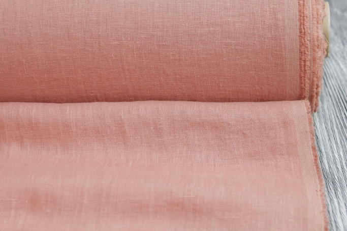 Льняная ткань бледно розового или лососёвого цвета с оттенком с эффектом жатости и лёгкой мятости, достигнутых путём специальной обработки - стирки с энзимами. Благодаря энзимной стирке, ткань приобретает приятные характеристики в виде невероятной мягкости и воздушности. Такой лён пользуется большим спросом, так как не дает усадку и не требует утюжки после стирки. Ткань с таким эффектом ещё называют вареный лён или stone washed. Нарочитая лёгкая равномерная жатость и мятость делает полотно стильным, расслабленным, эксклюзивным. Такой жатый эффект пользуется особой популярностью в Европе. Изделия из вареного льна обладают определённым шармом, а их обладатель характеризуется изысканным вкусом. Ткань - средней плотности, не просвечивает, идеальна для бохо-платьев, брючных и юбочных костюмов, юбок, жакетов, брюк, сарафанов.