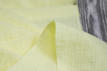 Мягкая льняная ткань с добавлением небольшого количества хлопка очень красивого жизнерадостного лимонного светло-жёлтого цвета с эффектом мятости и лёгкой жатости. Ткань - очень приятная и мягкая на ощупь, плетение жаккардовое, немного рыхлое, поверхность фактурная с перпендикулярным переплетением нитей, легко драпируется, за счёт умягчающей обработки, полотно уменьшается в размере, но становится более объемным и воздушным, после стирки становится ещё мягче. Ткань идеальна для использования в качестве пледов и покрывал, полотенец как банных, так и стильных кухонных, банных и домашних халатов, штор.